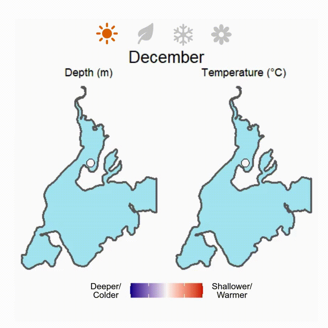 Seasonal movements of tagged brown bullhead catfish in Lake Rotoiti, Aotearoa New Zealand. Each circle represents a catfish tracked using acoustic telemetry over one year. Circle colours show how each fish’s depth and temperature differ from the daily average: red = warmer and shallower, purple = colder and deeper. White circles mean all fish are at similar depths and temperatures. This data reflects Southern Hemisphere seasons—December to February is summer, while June to August is winter. These patterns reveal when catfish shift offshore or stay near the lake bottom—critical insights for planning effective removal strategies.