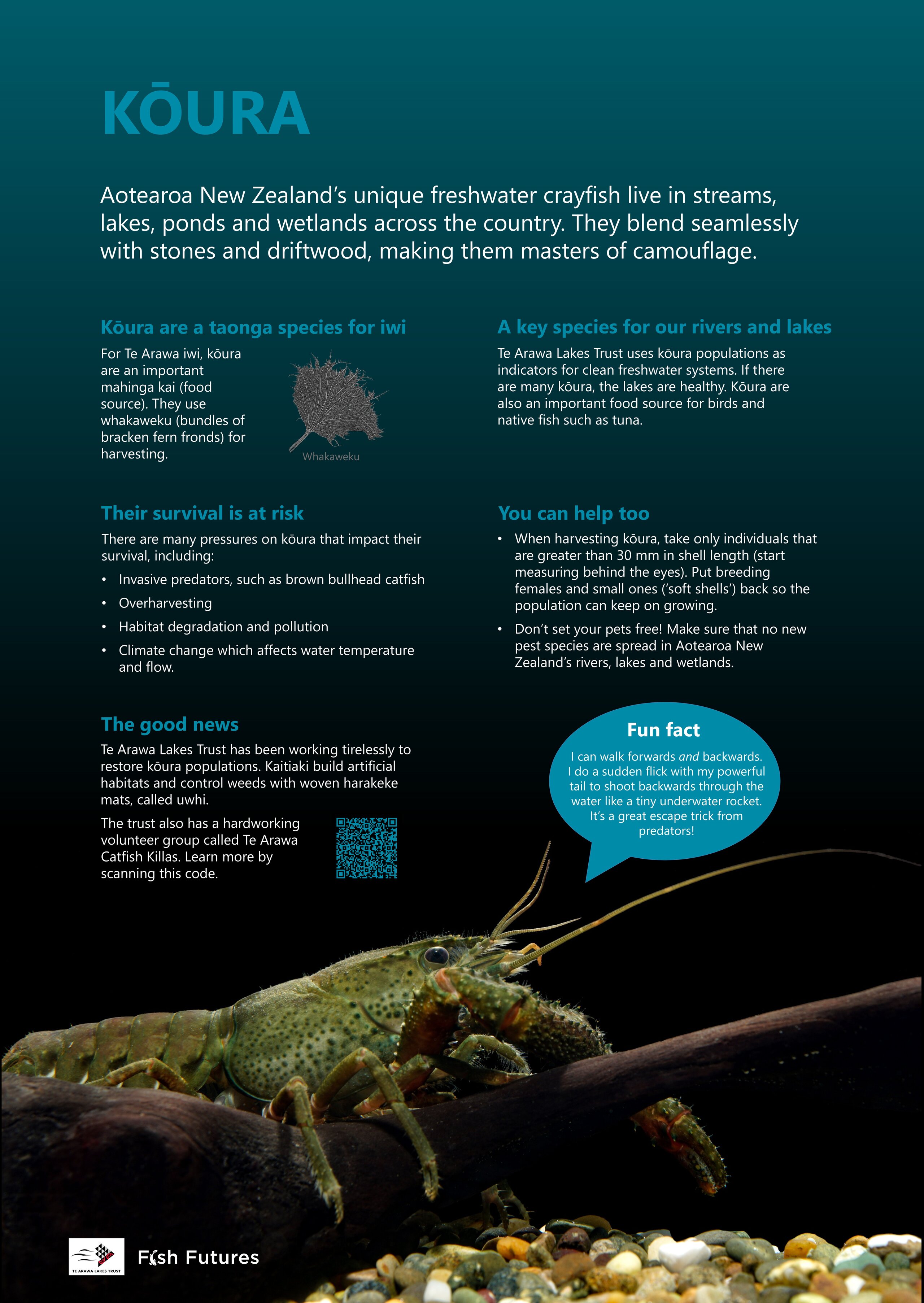 Over two busy days, they spoke with more than 1100 visitors about kōura (freshwater crayfish) — their importance to Te Arawa Iwi, the threats they face from introduced species such as catfish, and how community-led action can help restore and protect these taonga.